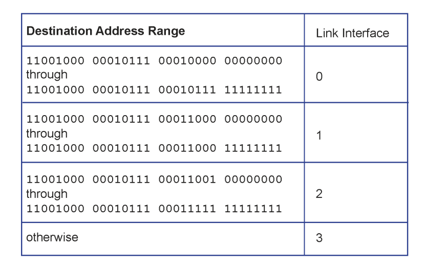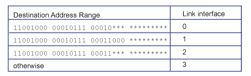 - 라우터는 이런 형식의 포워딩 테이블에서 패킷의 목적지 주소의 프리픽스를 테이블의 엔트리와 대응시킴.