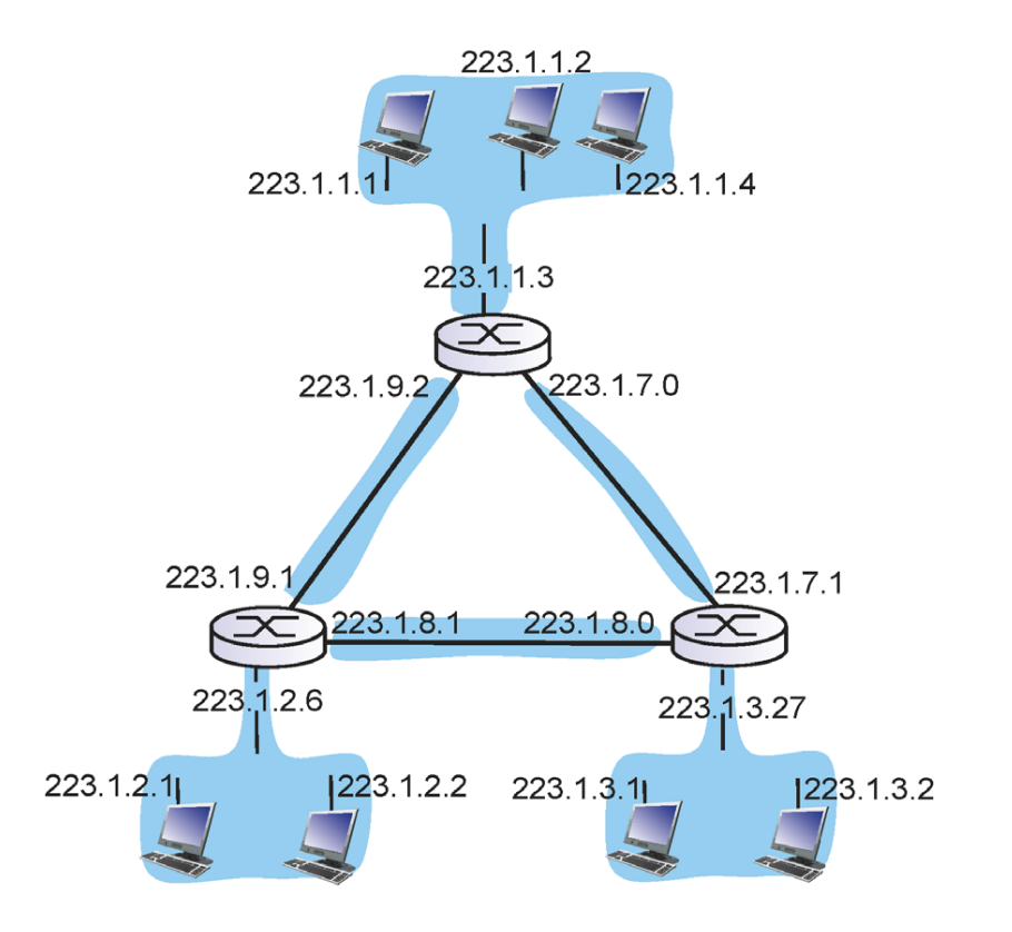 - 서브넷 223.1.1.0/24는 위 그림에서 세 호스트 인터페이스(223.1.1.1, 223.1.1.2, 223.1.1.3)와 하나의 라우터 인터페이스(223.1.1.4)를 구성함.