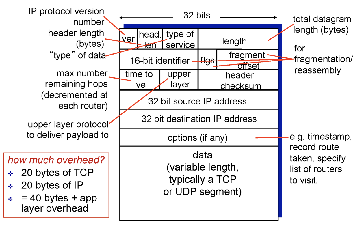 - TTL(Time-to-live): 네트워크에서 데이터그램이 무한히 순환하지 않도록 함. 이 필드 값은 라우터가 데이터그램을 처리할 때마다 감소함. TTL 필드가 0이 되면 데이터그램을 폐기함