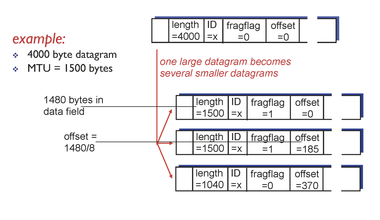 - 서로 다른 링크 계층 프로토콜이 요구하는 MTU를 맞추기 위해 라우터에서는 패킷을 더 작은 패킷으로 분할하며 이것을 Fragment라고 부름.