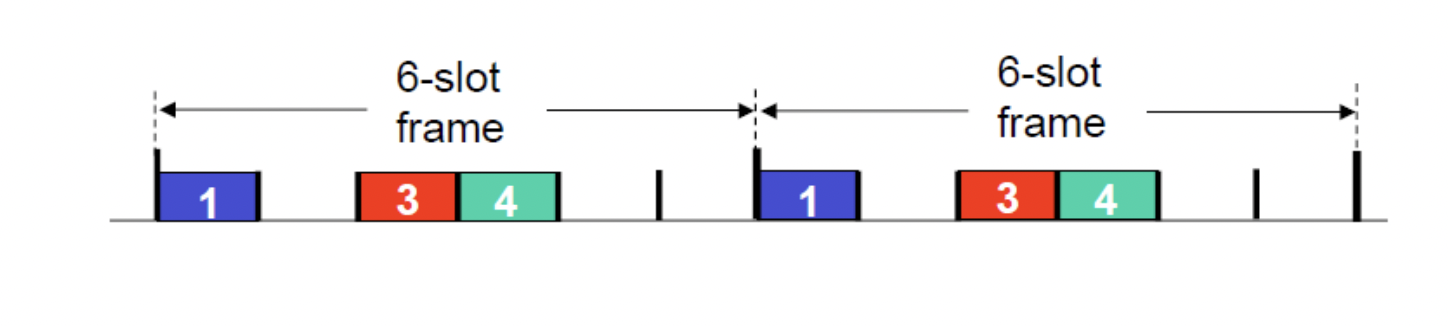 - 노드는 전송할 패킷이 있을 때마다 TDM 프레임에서 자신에게 할당된 시간 슬롯 동안 패킷 비트 전송.