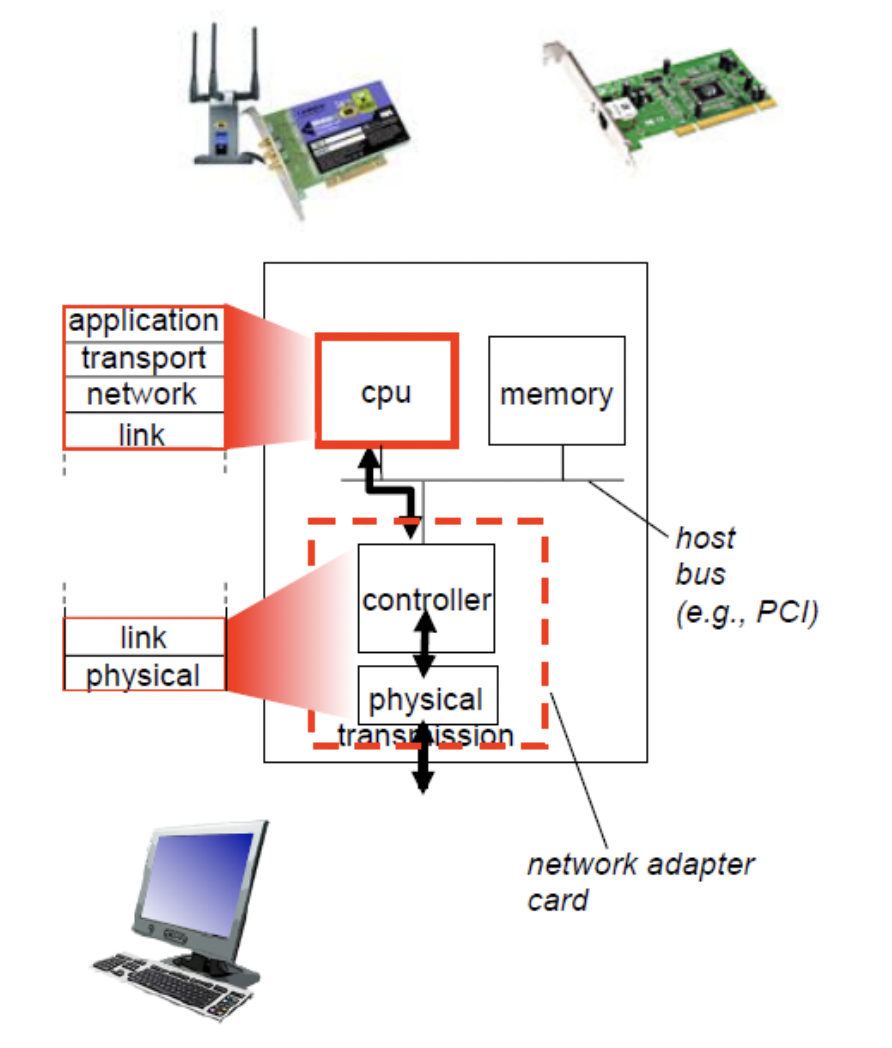 - 네트워크 어댑터의 중심에는 링크 계층 제어기가 있으며, 링크 계층 제어기는 링크 계층 서비스들(프레임화, 링크 접속, 오류 검출 등) 대다수가 구현되어 있는 단일의 특수 용도 칩임.