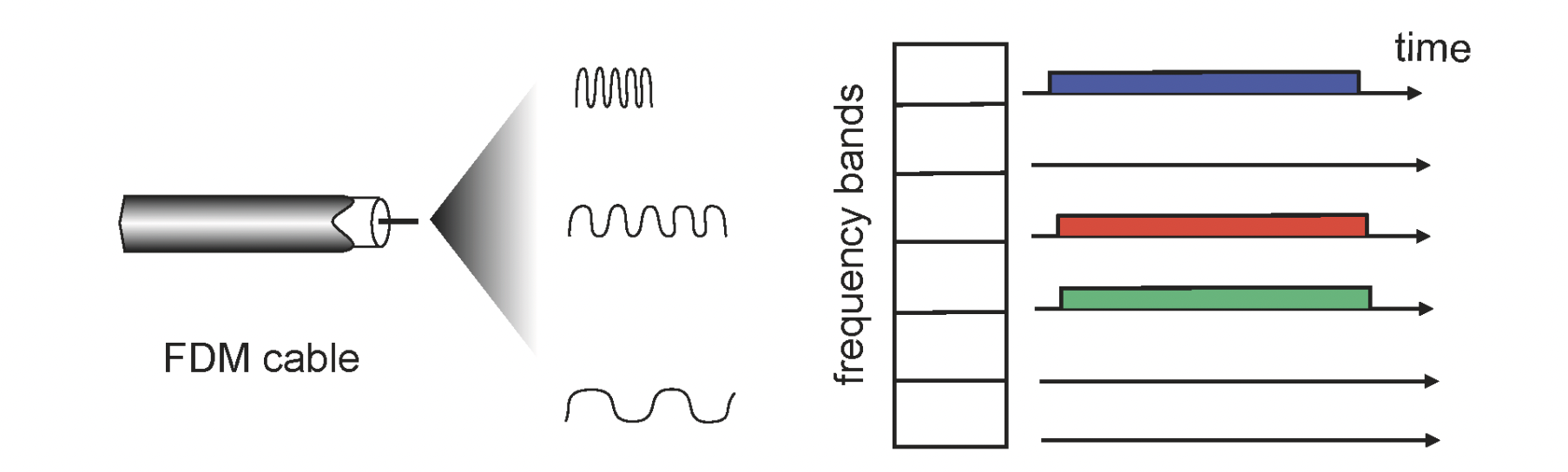 - R bps의 채널을 다른 주파수로 나눠서(각 R/N의 대역폭을 갖게 됨) 각 주파수를 N개 노드 중 하나에게 할당함.