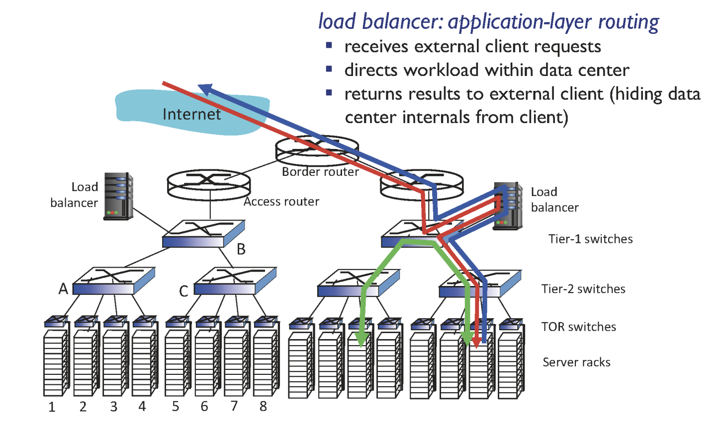 - 위 그림과 같이 계층화된 여러 스위치와 부하 균등기Load balancer를 사용하여 데이터 센터를 네트워킹 하고 있음.