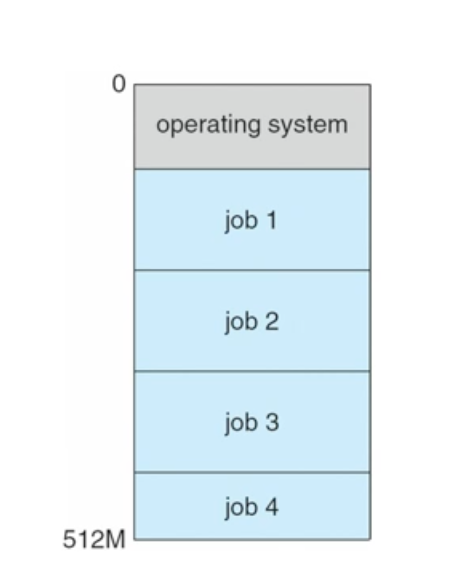 - 다중 프로그래밍: CPU가 항상 한 개는 실행할 수 있도록 프로그램을 구성하여 CPU 이용률을 높이는 것