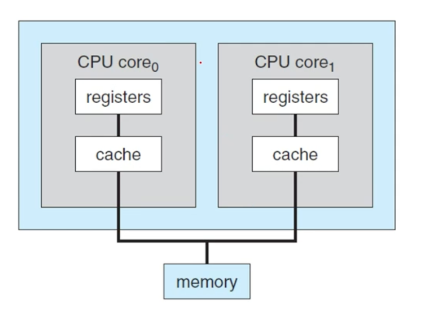 - 다중 코어mulicore: 동일한 CPU에 여러 컴퓨팅 코어를 포함함