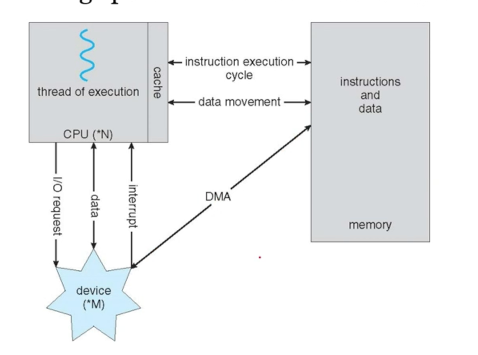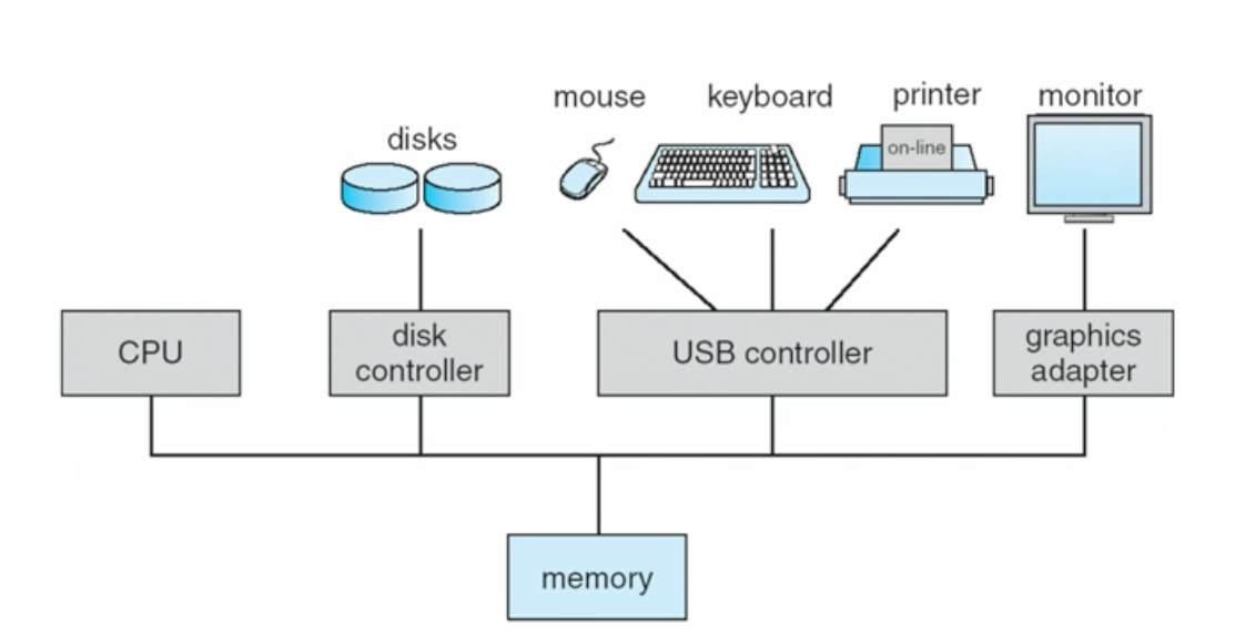 - 일반적인 컴퓨터 시스템은 하나 이상의 CPU와 구성요소와 공유 메모리 사이의 액세스를 제공하는 공통 버스를 통해 연결된 여러 장치 컨트롤러로 구성됨