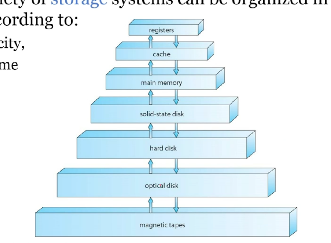- 다양한 저장장치 시스템은 저장 용량 및 액세스 시간, 휘발성/비휘발성에 따라 계층 구조로 구성될 수 있음