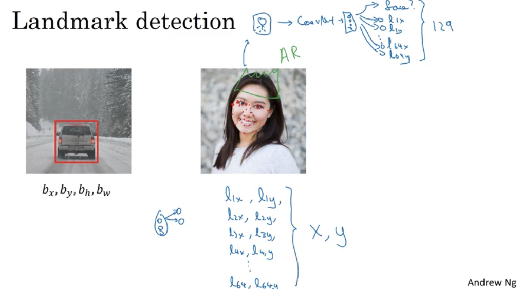 예를 들어 위 이미지에서 64개의 얼굴의 특징점을 뽑는다고 한다면 저번 포스팅에서 했듯 결과 레이블 y는 이란 얼굴이 있는지 없는지를 나타내는 출력값 p_c, 그리고 p_c가 참값일때의 특징점 값 l_1x, l_1y ... l_64x, l_64y까지 총 129개의 출력값을 갖게 된다. 이것이 바로 감정 인식의 기본 설계가 된다. 만약 얼굴이 아니라 자세 감지를 한다고 해도 어려운 것은 없다. 가슴 중앙이나 어깨, 팔꿈치, 손목 등과 같은 몇 가지 중요한 특징점을 출력 값으로 받으면 된다.