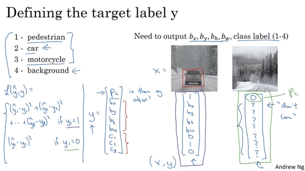 예를 들어 위와 같은 이미지에서 Object localization을 한다고 할 때, 목표 레이블 y는 원하는 물체가 있는지 없는지를 의미(물체 분류에 대한 확률)하는 p_c, 원하는 물체가 있을 경우의 bounding box의 값 b_x, b_y, b_h, b_w, 그리고 물체에 대한 분류값인 c1, c2, c3(pedestrian, car, motorcycle)가 있다.