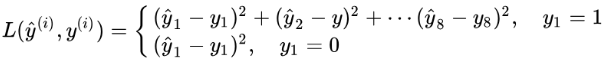 그리고 손실함수 값은 제곱 오차를 사용하여 y = 1인 경우, 즉 물체가 존재하는 경우에는 ( y^1 - y1)^2 + ( y^2 - y2)^2+ ... + ( y^8- y8)^2이 된다. 그리고 물체가 존재하지 않는 경우인 y = 0인 경우 손실 값은 (y^1 - y1)^2가 된다. 왜냐하면 y1을 제외한 모든 나머지 요소들은 무관하기 때문이다.
