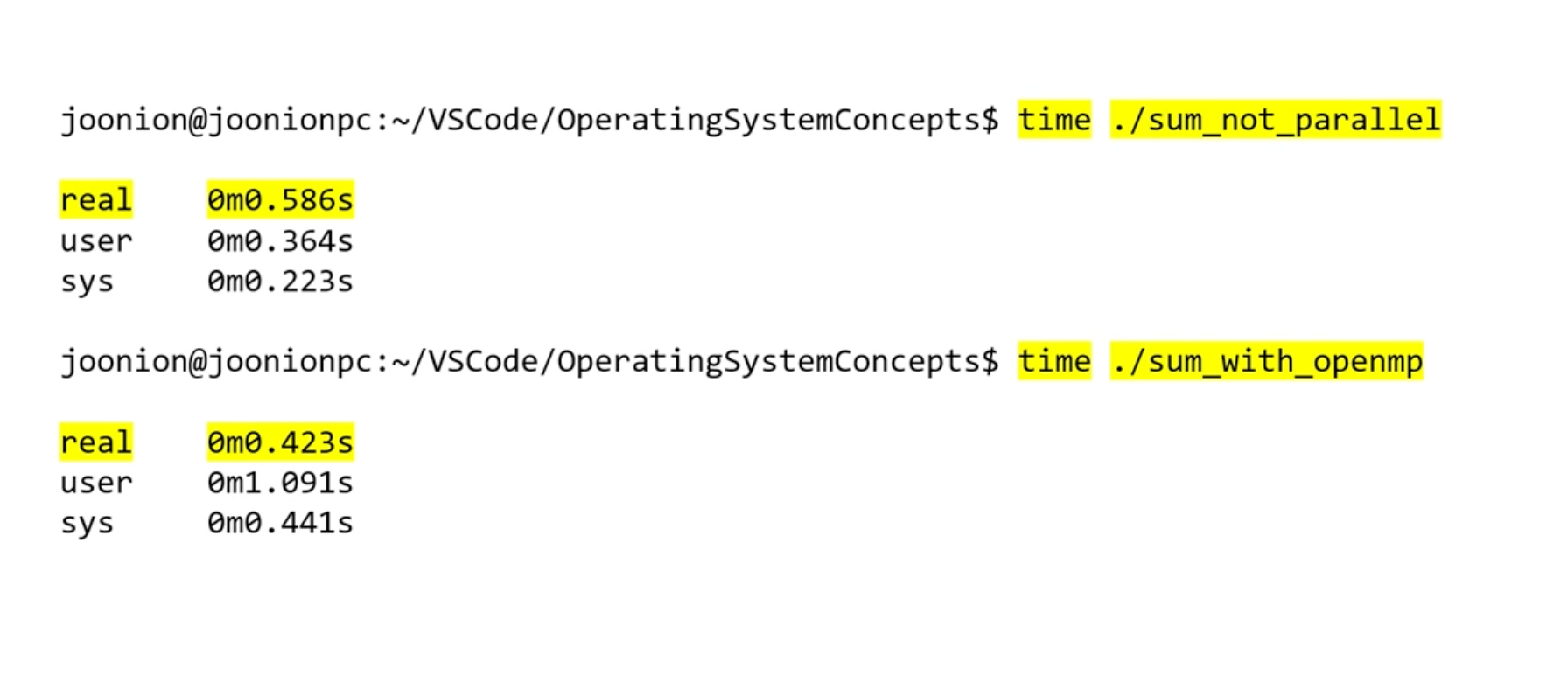 - Parallel한 연산을 수행한 코드가 real time에서 수행 시간이 더 짧았음