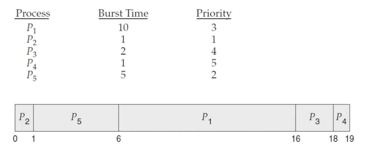 - 위 그림은 시간 0에 도착한 프로세스의 우선순위와 CPU 버스트 타임 집합과 이 경우의 Priority Scheduling을 사용한 프로세스 처리 시간을 간트 차트를 나타냄