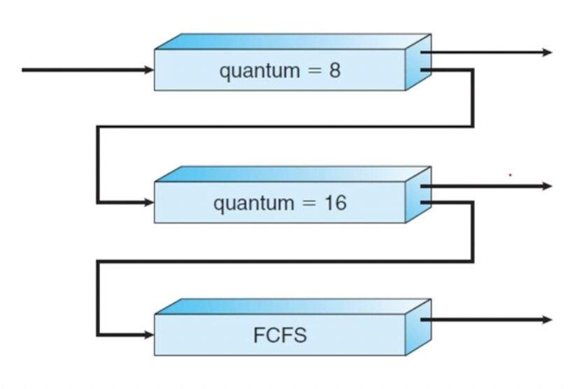 - 대조적으로 다단계 피드백 큐 스케쥴링 알고리즘에서는 프로세스가 큐들의 사이를 이동하는 것을 허용함