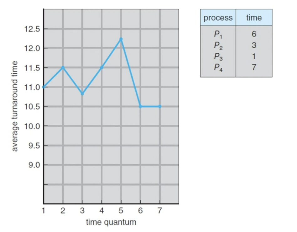 - 한 프로세스 집합의 평균 총처리시간은 시간 할당량의 크기가 증가하더라도 반드시 개선되지는 않음