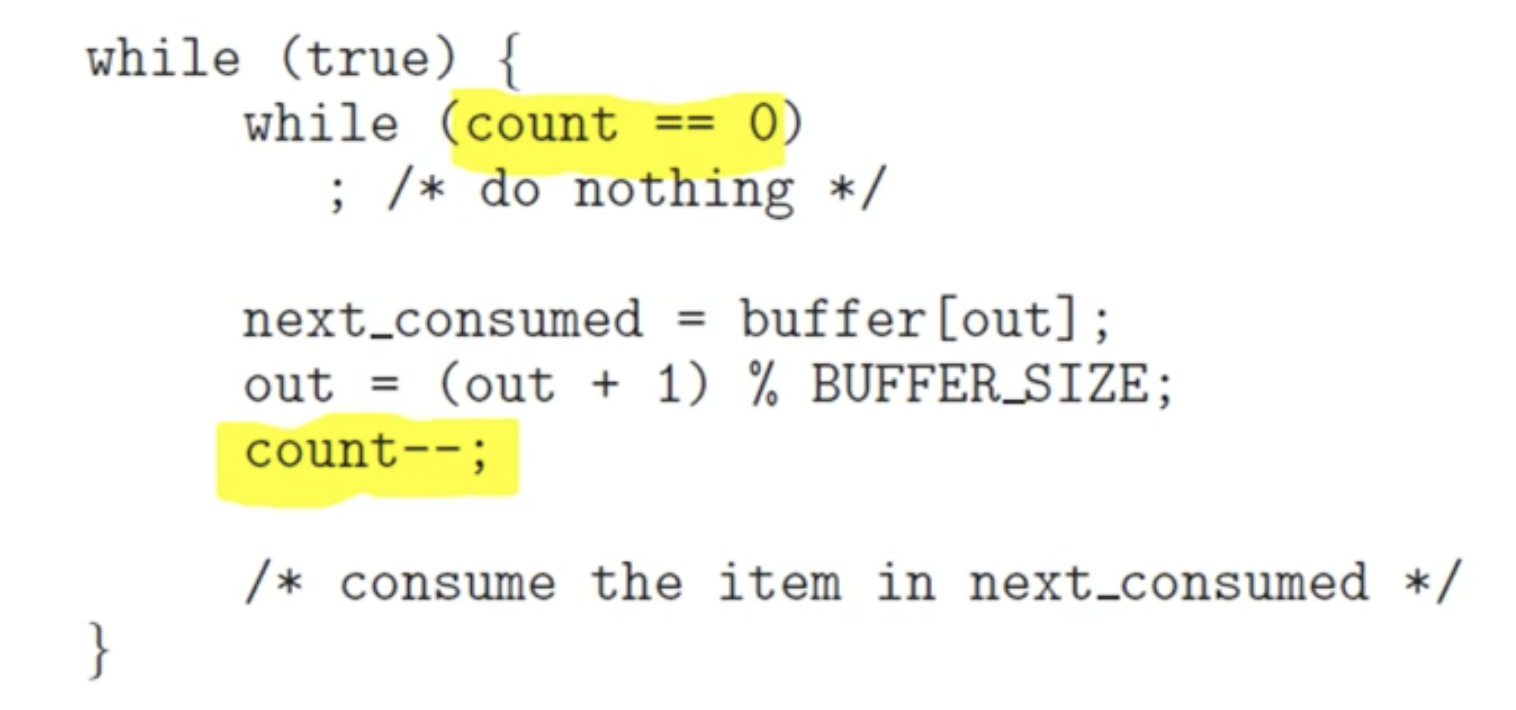 - 소비자: 버퍼에서 한 항목을 꺼낼 때마다 0으로 초기화 되어 있는 count값을 -1 감소함