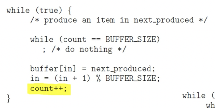 - 한 순간에 한 프로세스만이 변수 count를 조작하도록 보장하기 위해 프로세스들이 동기화synchronized되도록 할 필요가 있음