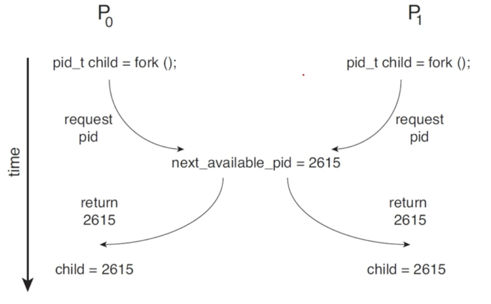 - 이 예시에서 커널변수 next_available_pid는 다음 사용 가능한 프로세스 식별자의 값을 나타내며 경쟁 조건에 있음