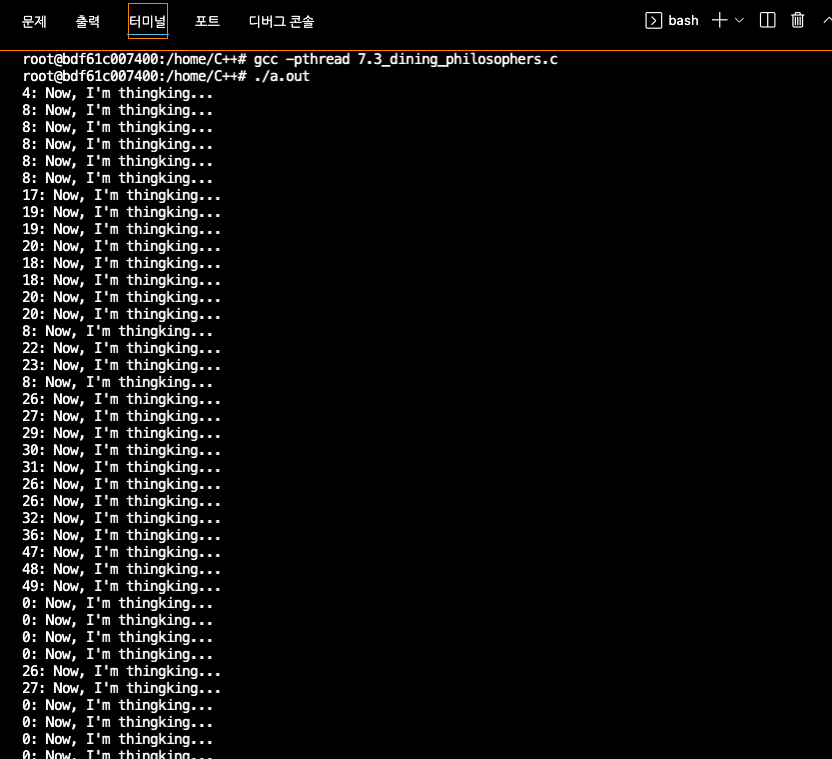 - 이 해결안은 이웃한 두 철학자가 동시에 식사하지 않는다는 것과 데드락이 발생하지 않는다는 것을 보장함