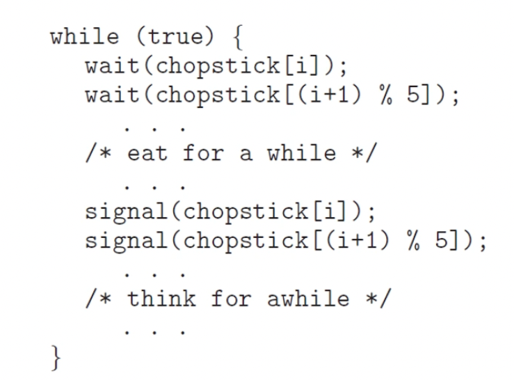 - 이 해결안은 인접한 두 철학자가 동시에 식사하지 않는다는 mutual exclusion 조건을 보장하지만, deadlock을 야기할 가능성이 있음