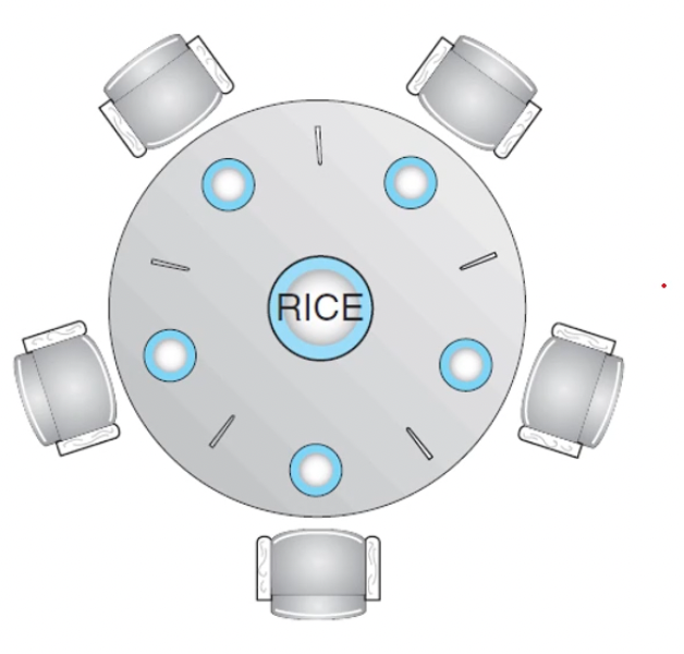 - 철학자들은 배가 고파지면 자신에게 가장 가까이 있는 두 개의 젓가락(왼쪽 젓가락과 오른쪽 젓가락)을 집으려고 시도함
