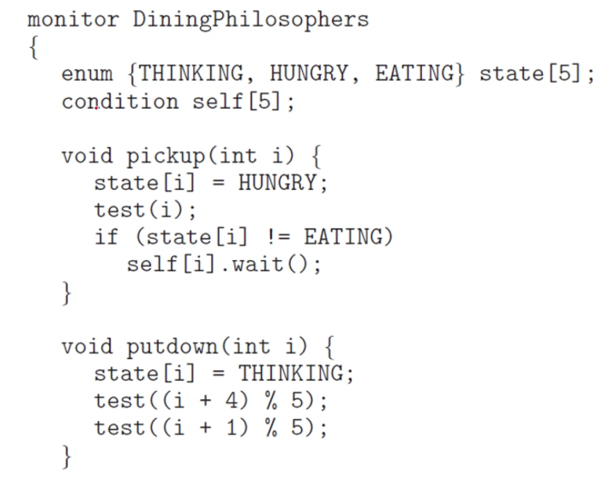 - condition 변수 Self를 사용하여 철학자 i가 배고프지만 자신이 원하는 젓가락을 집을 수 없을 때 젓가락 집기를 미룰 수 있도록 함