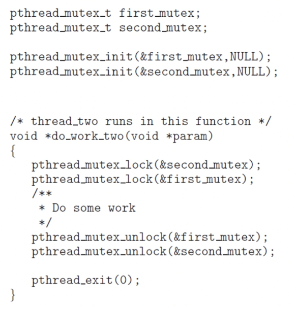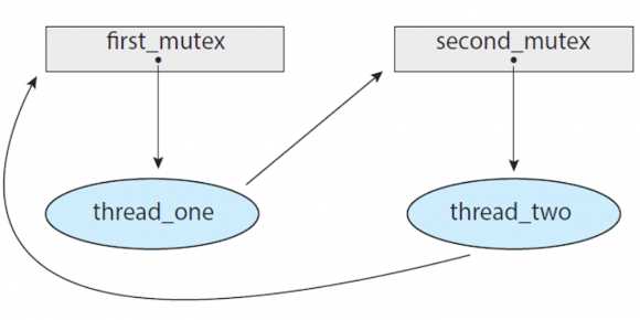 - 동시에 thread_two는 (1)second_mutex, (2)first_mutex 순서로 뮤텍스 락을 획득하려고 함