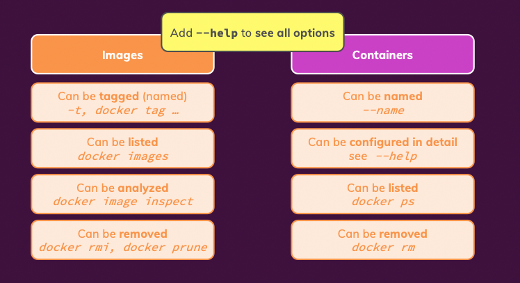- 모든 도커 명령어에 --help를 추가하여 사용 가능한 모든 옵션을 볼 수 있음