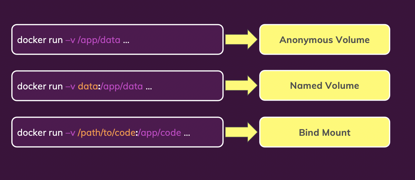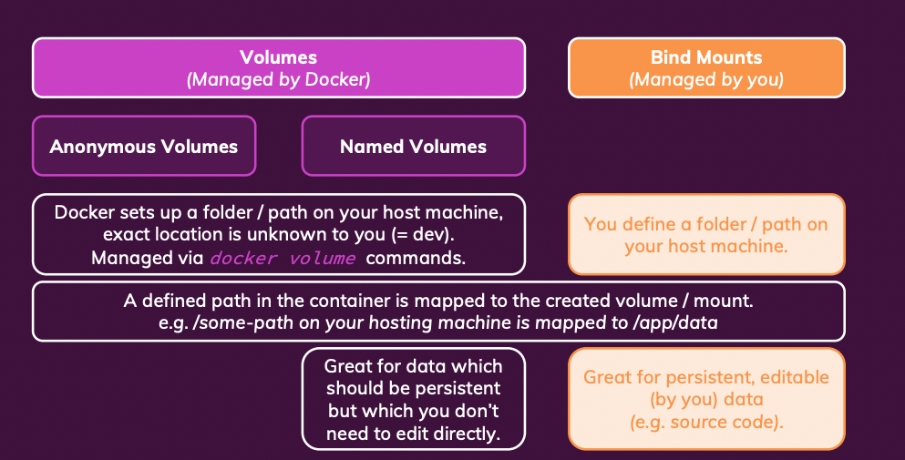 - docker run 명령어로 수행되며, 개발 중에 바인드 마운트를 사용하여 실시간으로 업데이트 하는데 사용됨