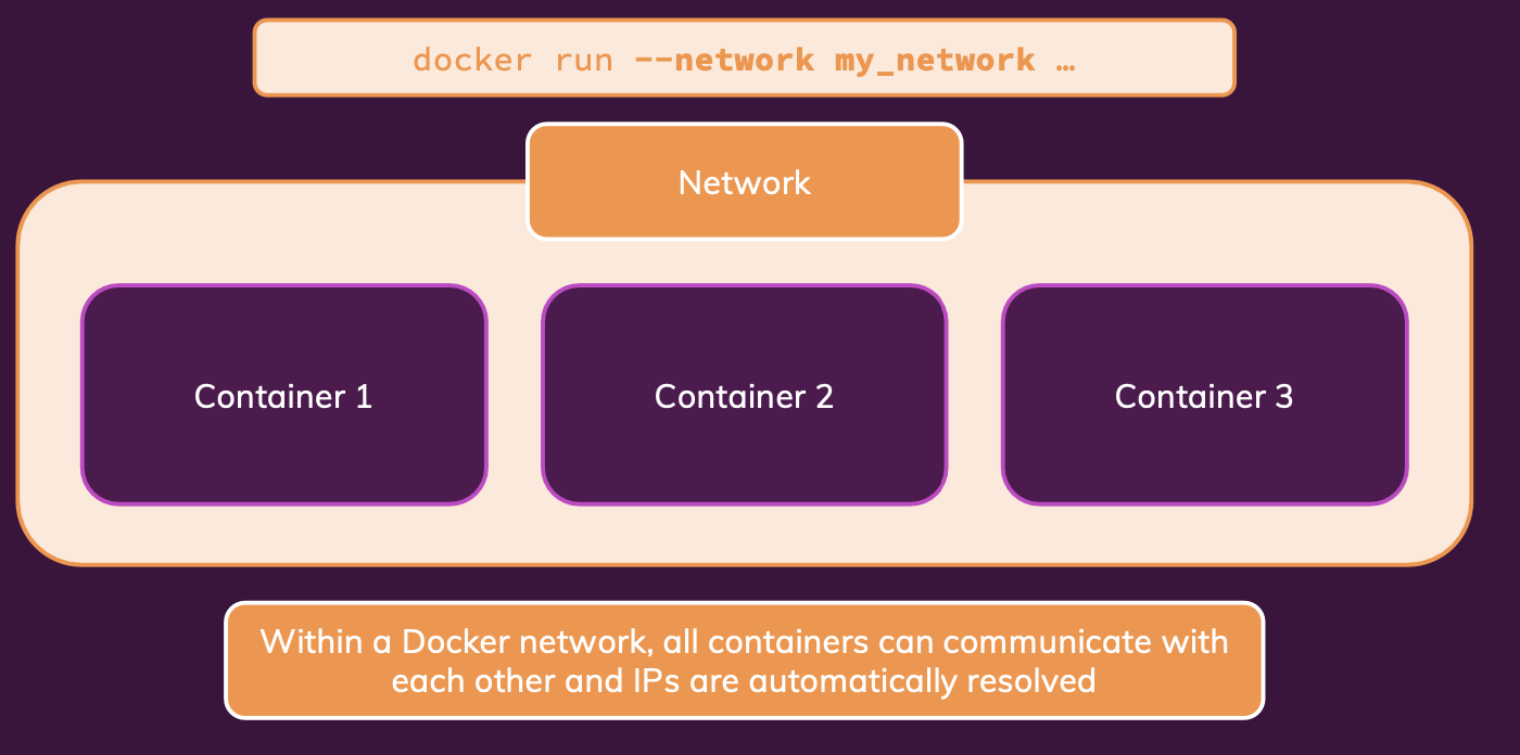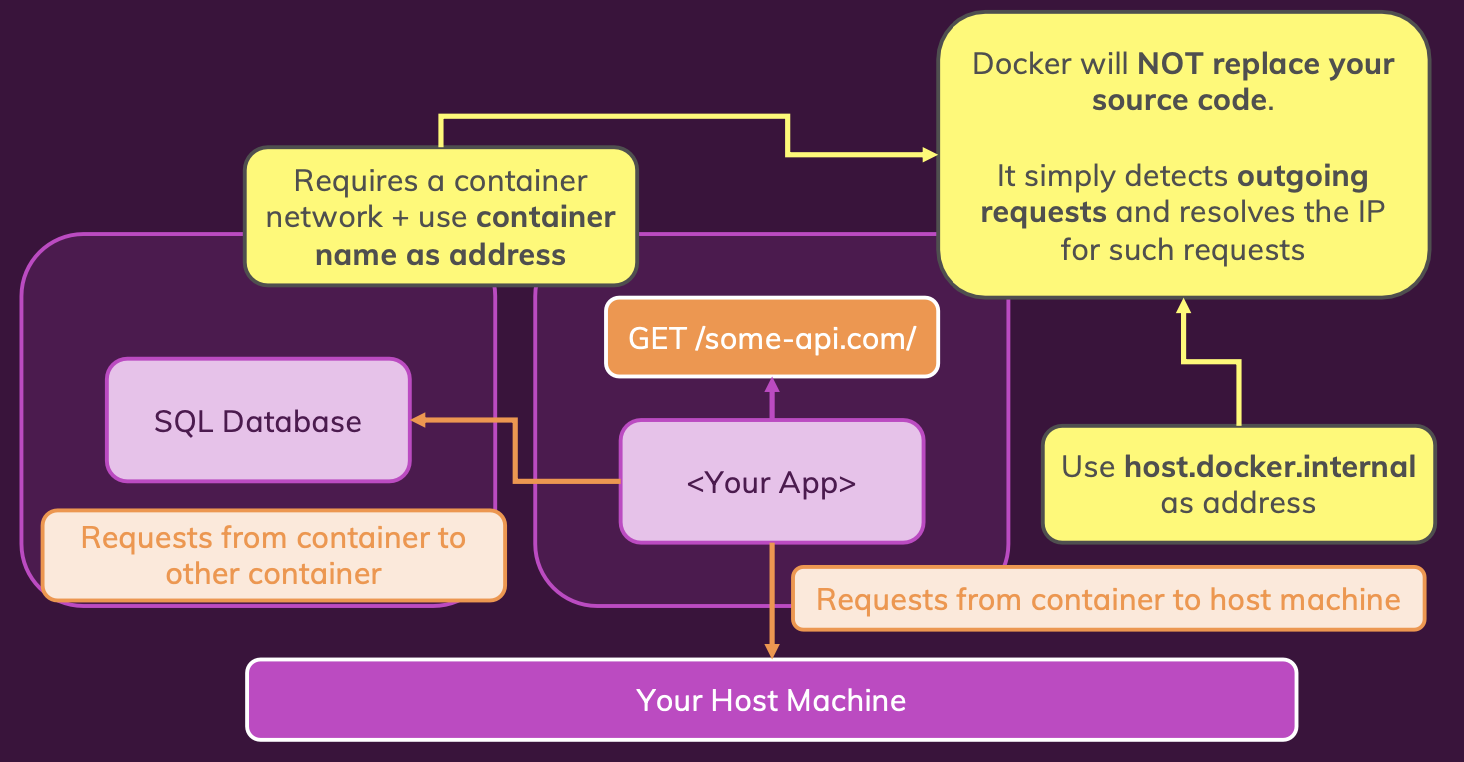 - 도커는 애플리케이션이 실행되는 환경을 소유하고, 애플리케이션이 HTTP 요청이나 MongoDB 요청 또는 컨테이너에서 다른 종류의 요청을 보내는 경우에 이를 인식함