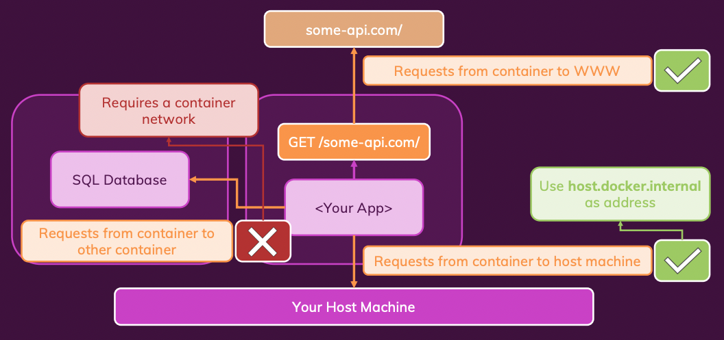 - 즉, 컨테이너는 docker.internal URL을 사용하면 호스트 컴퓨터와 통신할 수 있음