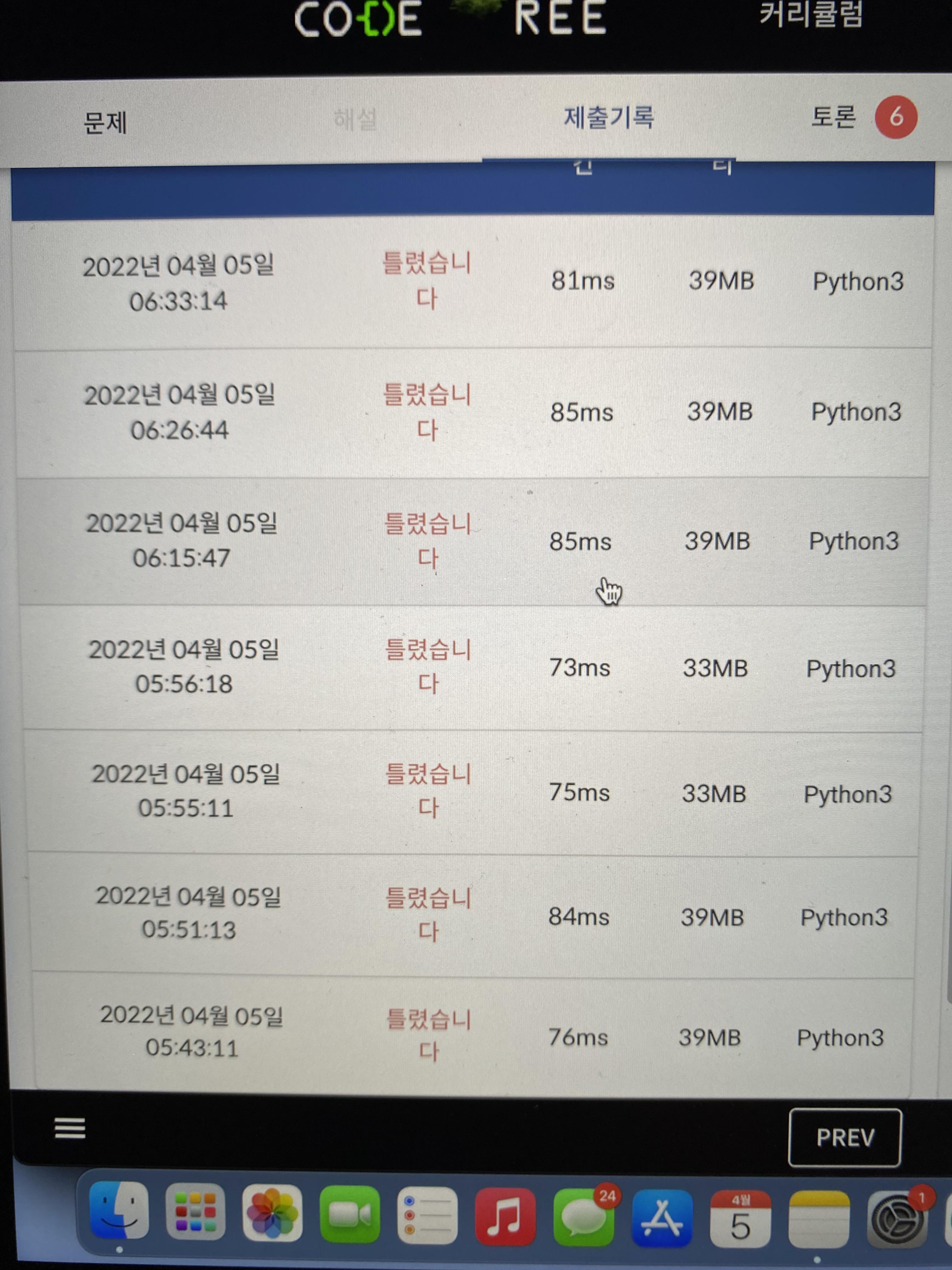 지금 되돌아보면 알고리즘이 문제를 풀어도 늘지 않는것 같다고 생각했던 시점이 이때부터 였던 것 같다. (이때부터 양치기를 했어야 했는데.. ㅋㅋ)