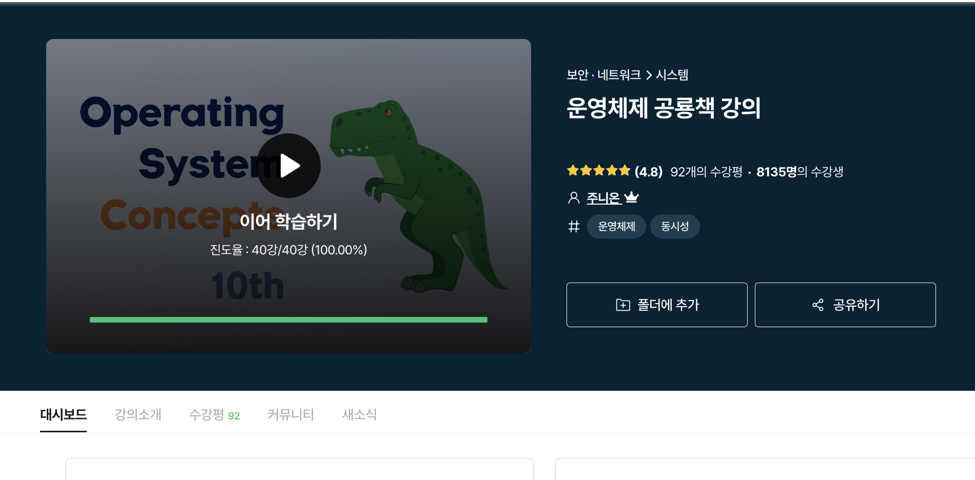 또 다른 것은 네트워크 스터디를 마치고 이 강의를 보면서 운영체제 스터디를 시작했다. 마찬가지로 강의를 들으며 들은 내용을 바탕으로 블로그에 포스팅하는 방식을 사용했다. (여기서 확인할 수 있다.)