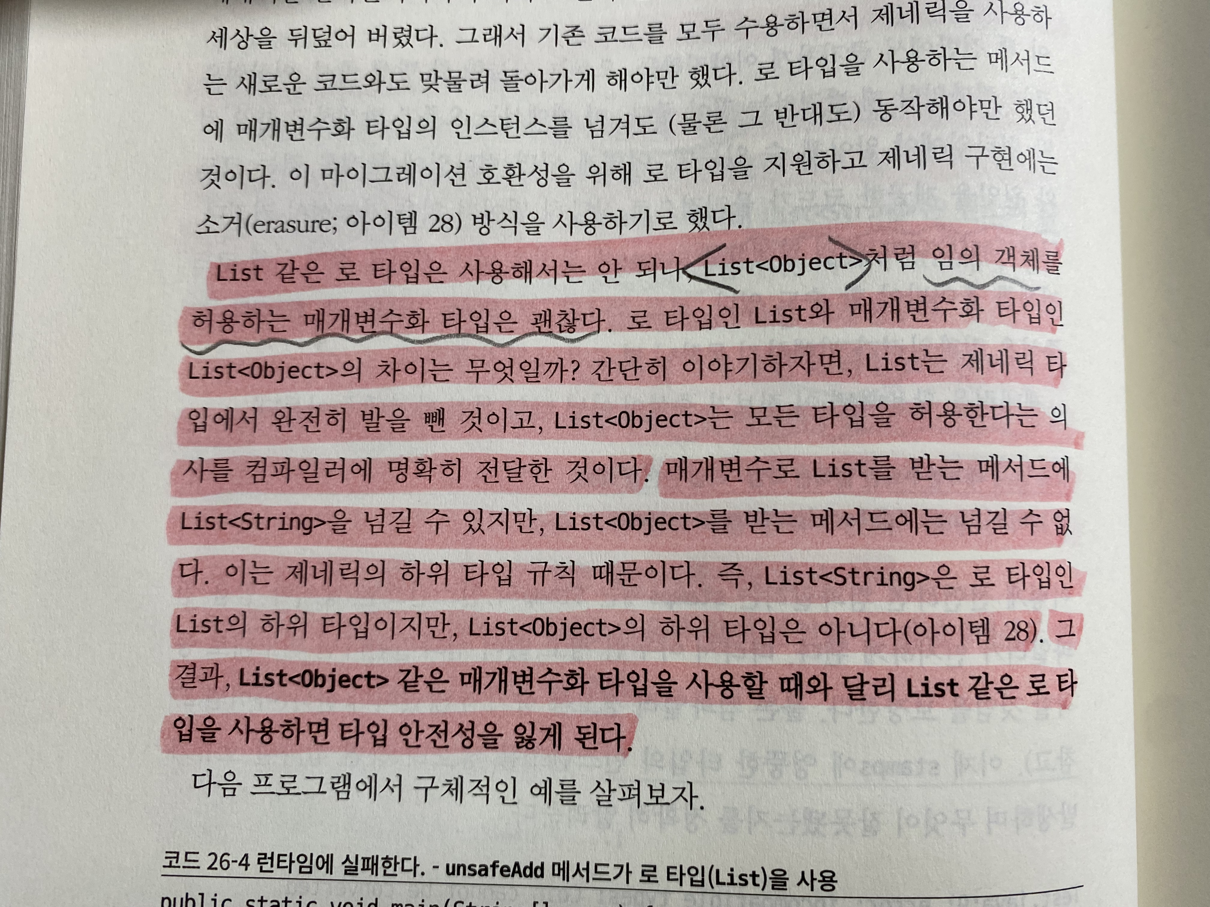 위 사진에 있는 밑줄 친 부분은 임의 객체를 사용하는 List<Object>과 달리 List 로타입을 사용하면 안정성을 잃는다는 내용인데, 그 이유가 List<String>을 매개변수로 넘기는 경우를 예시로 하여 적은 것이다. List<String>을 매개변수로 넘길 때 매개변수로 List를 지정해 놓은 메서드에는 넘길 수 있지만, List<Object>를 지정해 놓은 메서드에는 넘길 수 없는 데 그 이유는 List<String>이 로타입 List의 하위 타입이지만 List<Object>의 하위타입은 아니기 때문이라는 것이다. 즉, List는 제네릭 타입 체크를 전혀 하지 않고, List<Object>는 모든 제네릭 타입을 허용하므로 훨씬 타입 안정성 면에서 좋다.