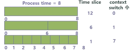 - time slice가 너무 짧을 때: Process Sharing effect(각 프로세스가 CPU가 자기만 수행하는 것 같은 착각을 일으킴)가 일어남.