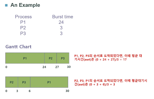 ⑦ 문제점 : Convoy effect때문에 CPU와 I/O장치들의 idle time이 커지게 됨으로써 CPU와 입출력 장치 사용률(utilization)이 낮아지게 되는 단점이 있음
