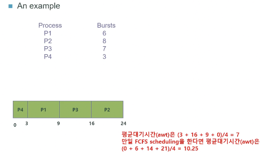 ① 다음에 수행해야 할 CPU burst들 중에서 가장 작은 수행 시간을 갖는 프로세스부터 선택