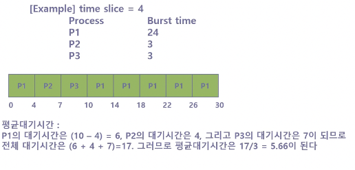 4. FCFS와 비슷하나 일정 시간이 되면 프로세스끼리 switch 한다는 preemption이 추가됨.