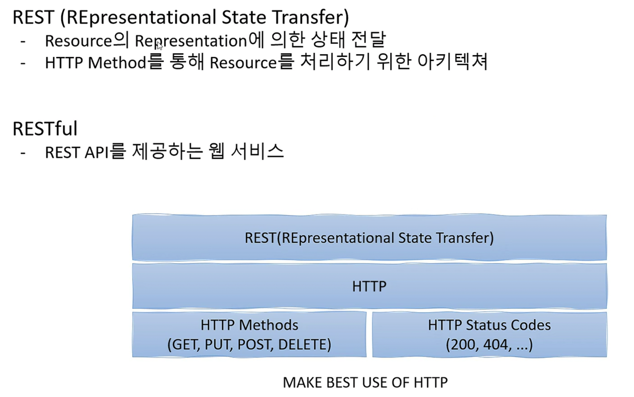 - REST(REpresentation State Trnsfer)는 상태, 즉 컴퓨터가 가지고 있는 자원(ex. 파일, DB에 저장된 데이터 등)을 전달하는 것.