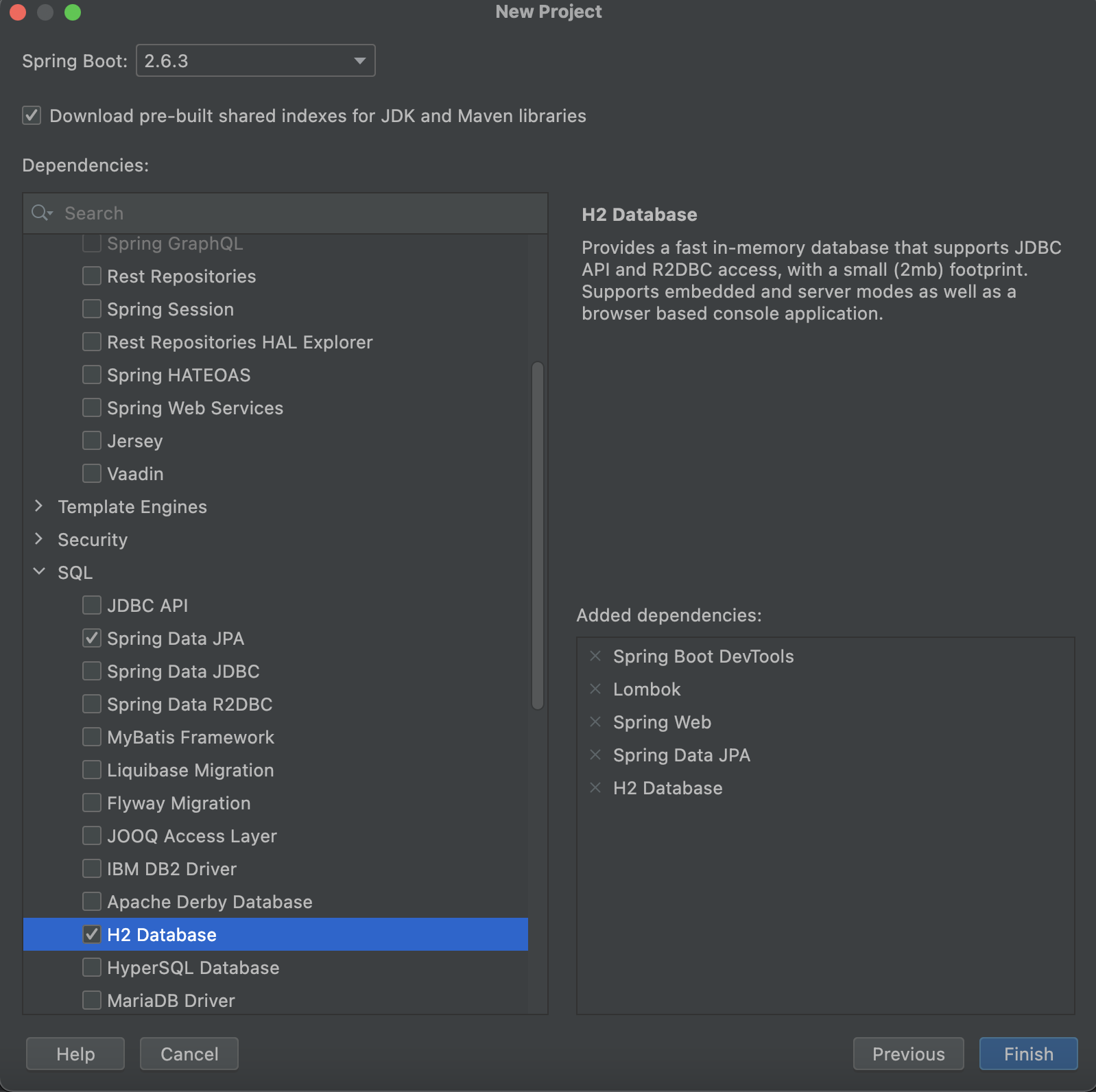 - Dependencies : Spring Boot DevTools, Lombok, Spring Web, Spring Data JPA, H2 Database