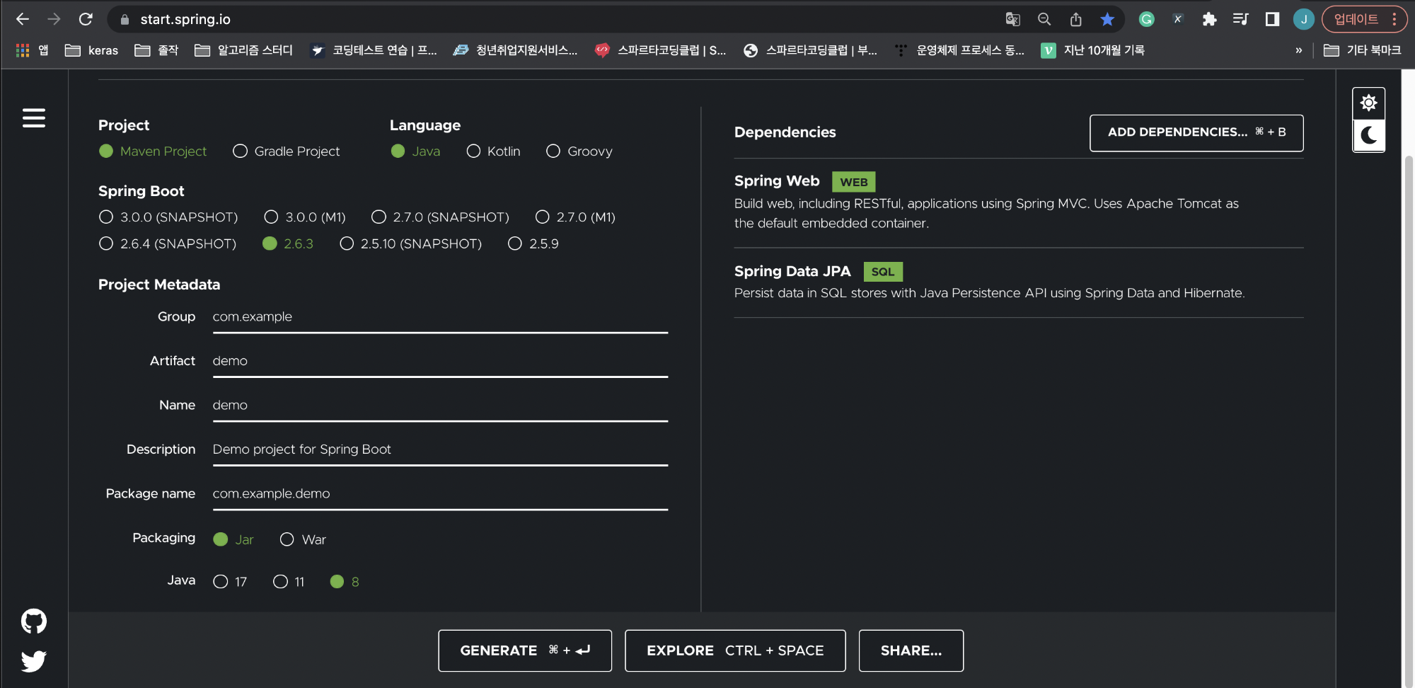 - Dependencies (Spring Boot 프로젝트에서 사용할 라이브러리 설정) : Spring Web, Spring Data JPA