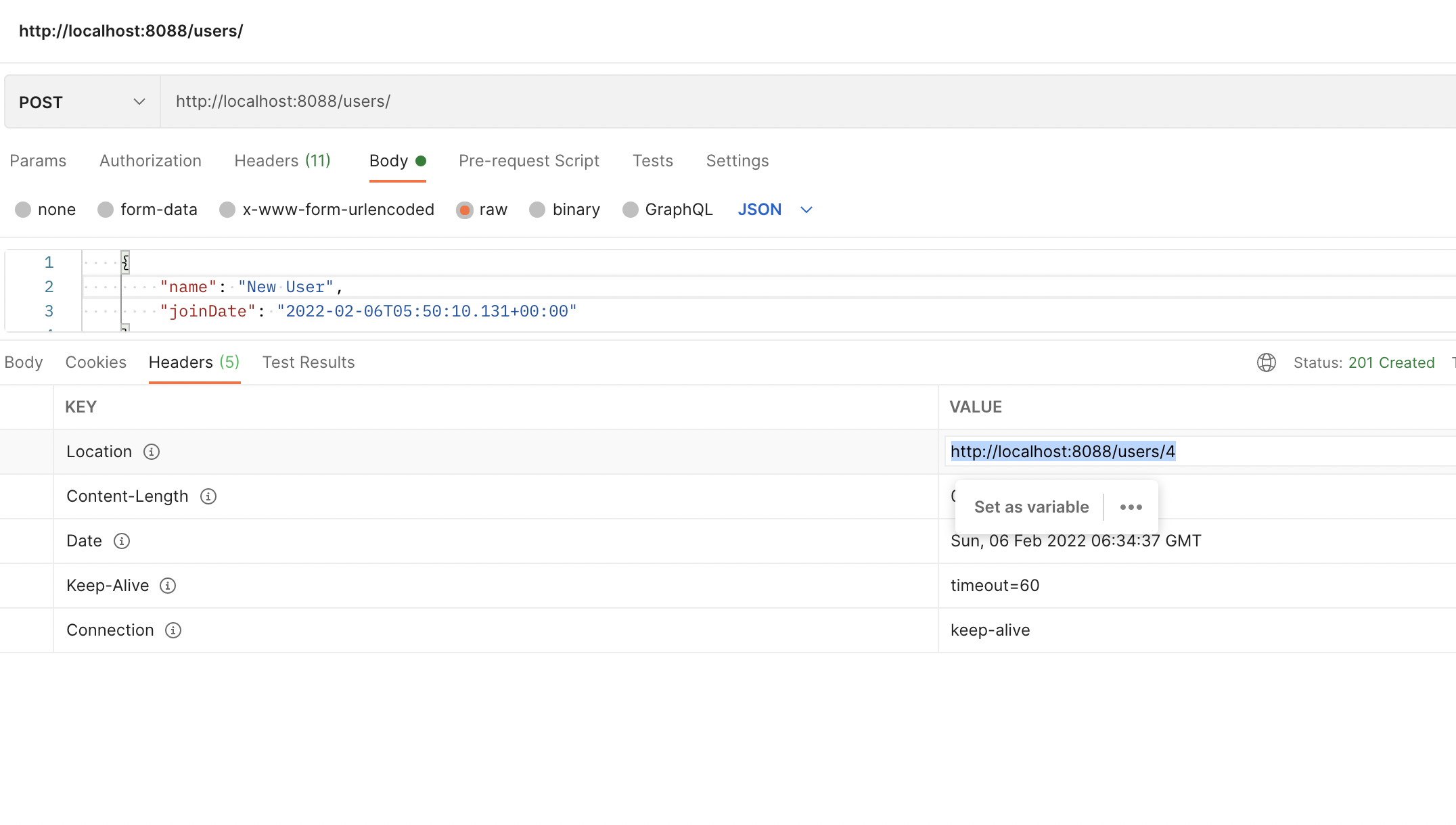 - 요청된 사용자 추가 후, 어떤 URI를 통해서 추가된 리소스 확인할 수 있는지도 반환 (이때 반환된 리소스로 상세 정보를 확인할 수 있음)