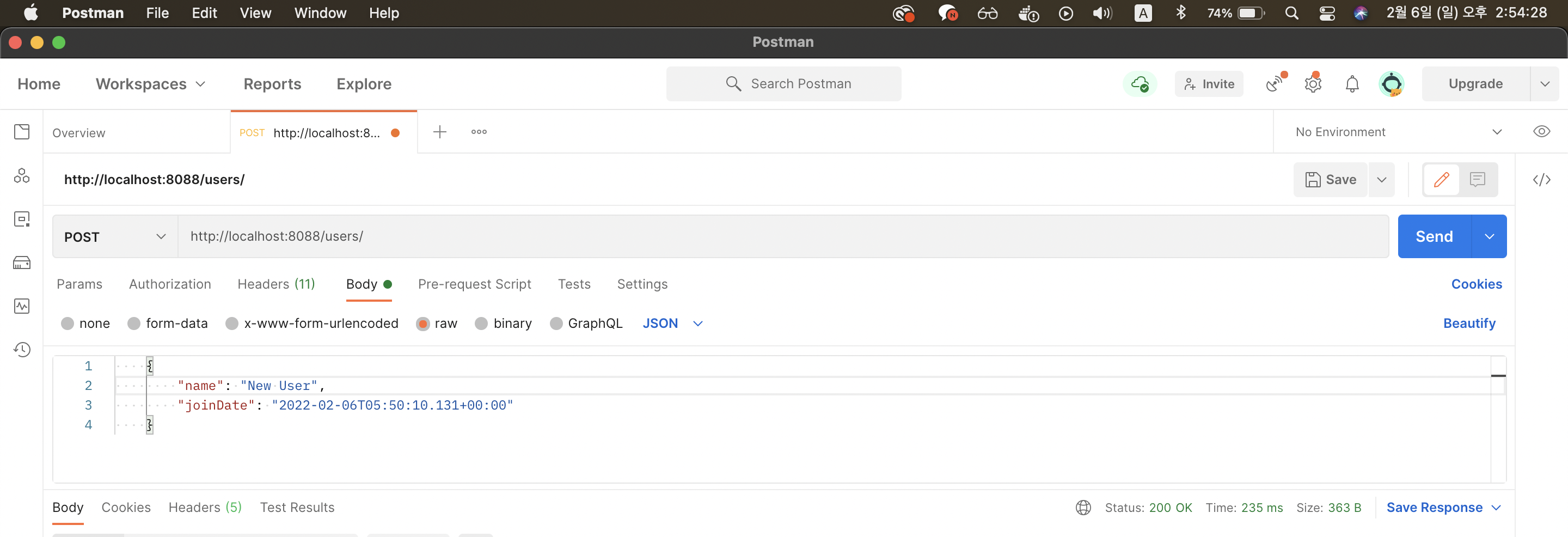 - 클라이언트로부터 post method를 통해서 추가하고자 하는 메소드를 user domain 타입으로 받기