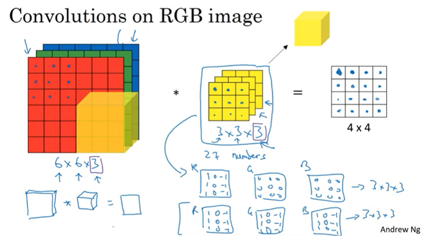 6 x 6 x 3 이미지와 3 x 3 x 3 사이즈의 세로 검출기 필터를 합성곱 연산을 하면 4 x 4 사이즈의 세로 윤곽선 결과 이미지가 나오고, 3 x 3 x 3 사이즈의 가로 검출기 필터 합성곱 연산을 하면 또 4 x 4 사이즈의 가로 윤곽선 결과 이미지가 나온다.
