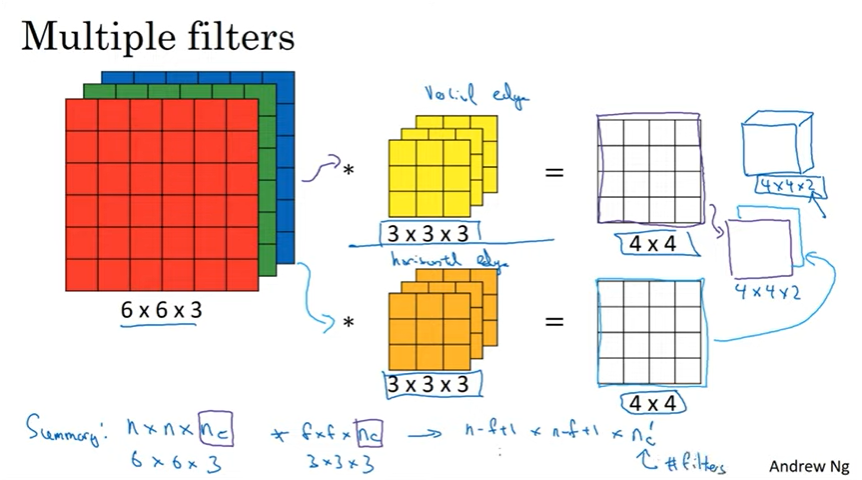 일반화 해 보자면 N x N x Nc 이미지와 F x F x Nc 필터를 합성곱 연산하면 N-F+1 x N-F-1 x Nc의 결과 이미지가 나오며, 이 때 stride = 1이고 padding=0을 가정한다.