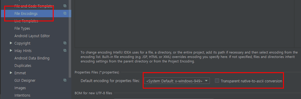 - 이 때, 한글 깨짐을 방지하기 위해서 인텔리제이에서 인코딩을 utf-8로 변경해주어야 함