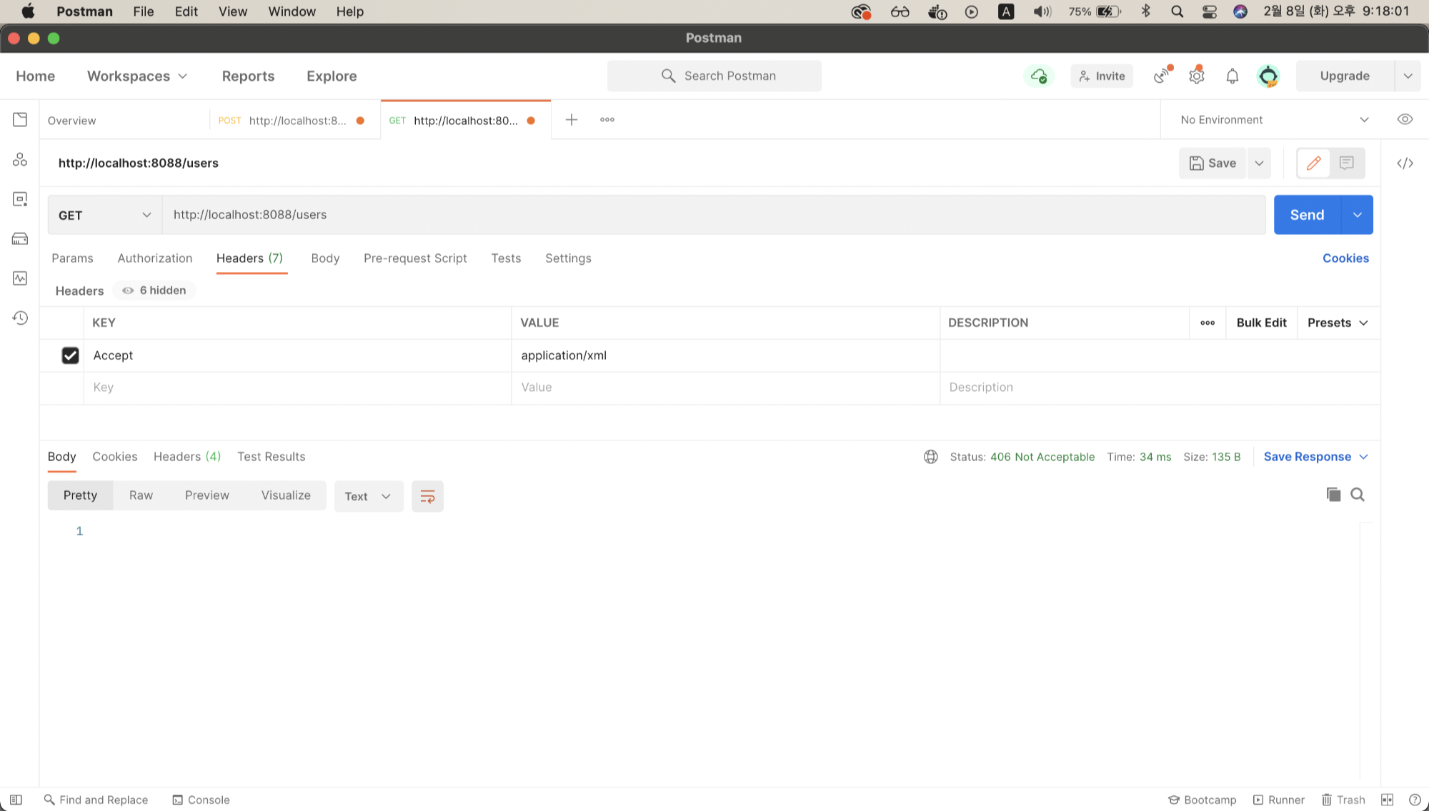 - 정상적인 API이나 406 에러가 뜨고 Body에 아무것도 나타나지 않음