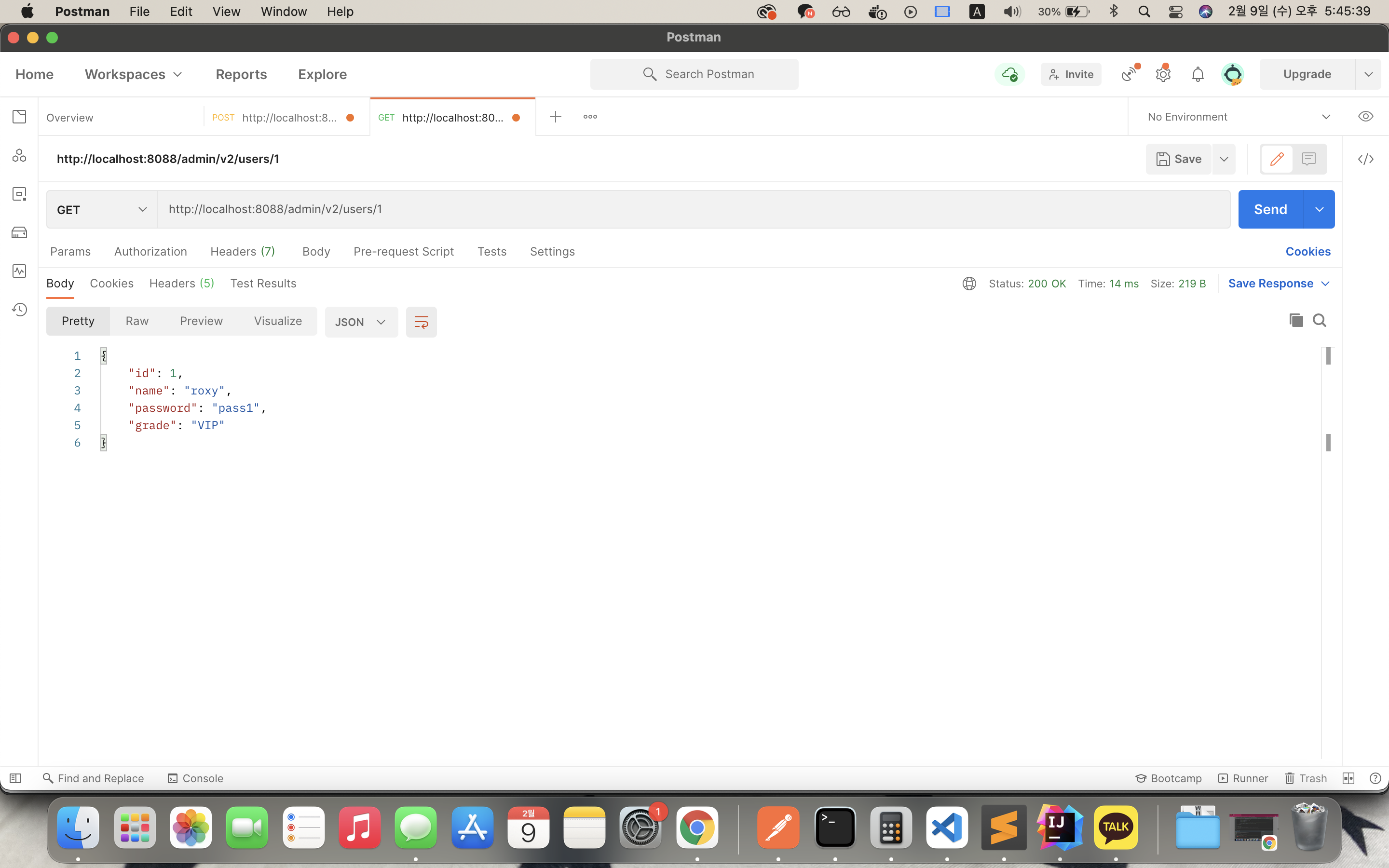- 이 때 User 클래스에 매개변수가 없는 Default 생성자가 없으면 @AllArgsConstructor 어노테이션에서 에러가 발생하므로 User 클래스에 돌아가서 @NoArgsConstructor 어노테이션을 추가해서 Default 생성자 생성