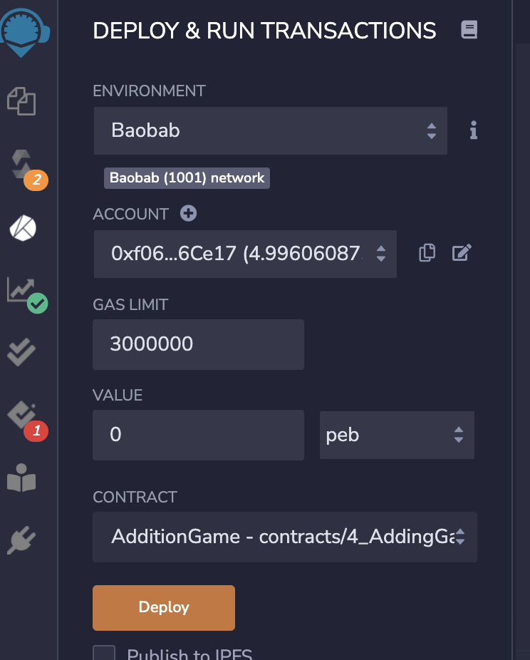- ACCOUNT에 내 Private key 등록하여 내 계좌 등록, ENVIRONMENT Baobab, CONTRACT에 AddingGame이 선택된 것 확인하고 DEPLOY 눌러 배포
