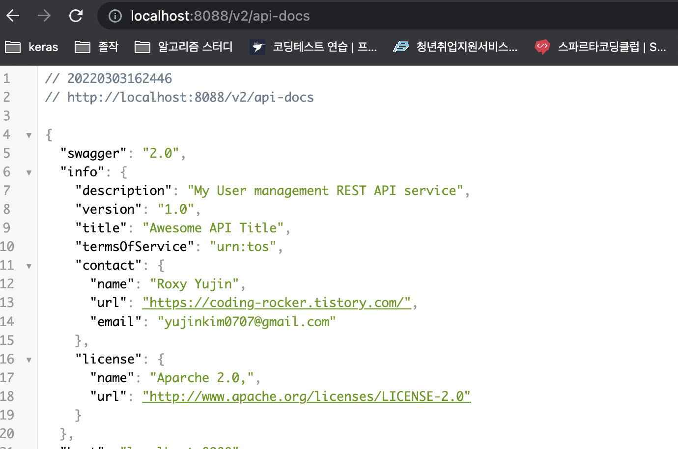 - @Configuration 어노테이션 추가하여 설정에 해당 빈 올리기, @EnableSwagger2 어노테이션 추가하여 swagger 용도로 사용하는 것 설정